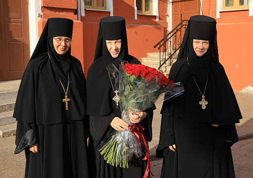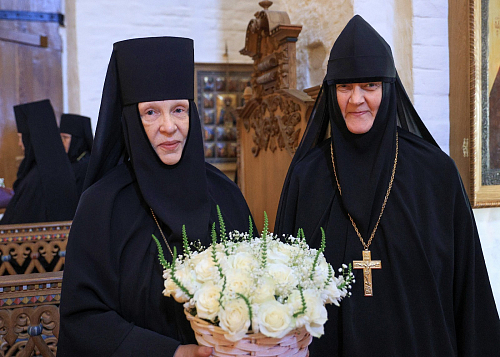 По завершении богослужения Высокопреосвященнейший митрополит Феогност огласил поздравление Святейшего Патриарха Московского и всея Руси Кирилла игумении Викторине с 70-летием и передал матушке Патриаршую грамоту.