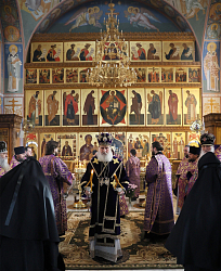 Его Высокопреосвященству сослужили настоятель Покровского скита Свято-Троицкой Сергиевой лавры архимандрит Ефрем (Елфимов), клирики Хотькова монастыря.