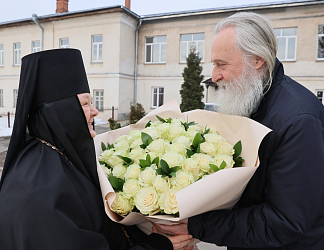 По окончании Литургии митрополит Феогност зачитал поздравление Святейшего Патриарха Московского и всея Руси Кирилла настоятельнице Покровского Хотькова монастыря с 40-летием монашеского пострига.