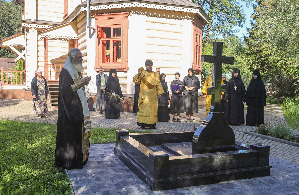 Затем владыка Феогност отслужил литию на могиле первого настоятеля храма протоиерея Александра Москаленко захороненого за алтарем храма. Далее архиерей посетил бывшее подворское кладбище, где захоронены последняя настоятельница монастыря игумения Епифания (Митюшина, +12.01.1931 г.), духовник сестер схиигумен Кирилл (+15/28.02.1929 г.), насельницы обители.