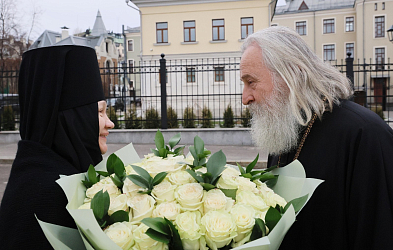 По прибытии в монастырь митрополит Феогност поздравил настоятельницу Зачатьевской обители игумению Иулианию (Каледу) с днем пострига и днем рождения и вручил ей букет цветов.
