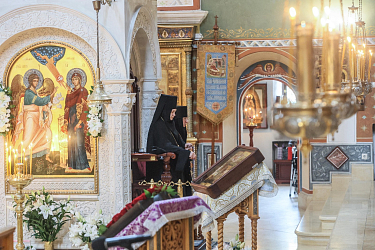 За Литургией молились заместитель председателя Синодального отдела по монастырям и монашеству, настоятельница Зачатьевского ставропигиального монастыря игумения Иулиания (Каледа), настоятельница Никитского монастыря в деревне Бывалино Московской области игумения Капитолина (Филиппенко), сестры и прихожане обители.