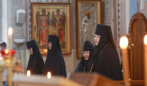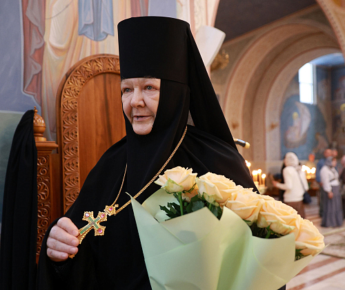 По окончании Литургии митрополит Феогност зачитал поздравительный адрес Святейшего Патриарха Московского и всея Руси Кирилла игумении Олимпиаде с днем тезоименитства.