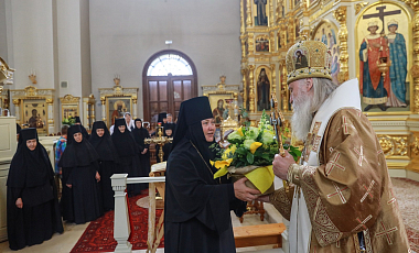 Затем митрополит Феогност зачитал поздравление Святейшего Патриарха Московского и всея Руси Кирилла и поздравил матушку игумению с сестрами со знаменательными датами.