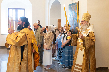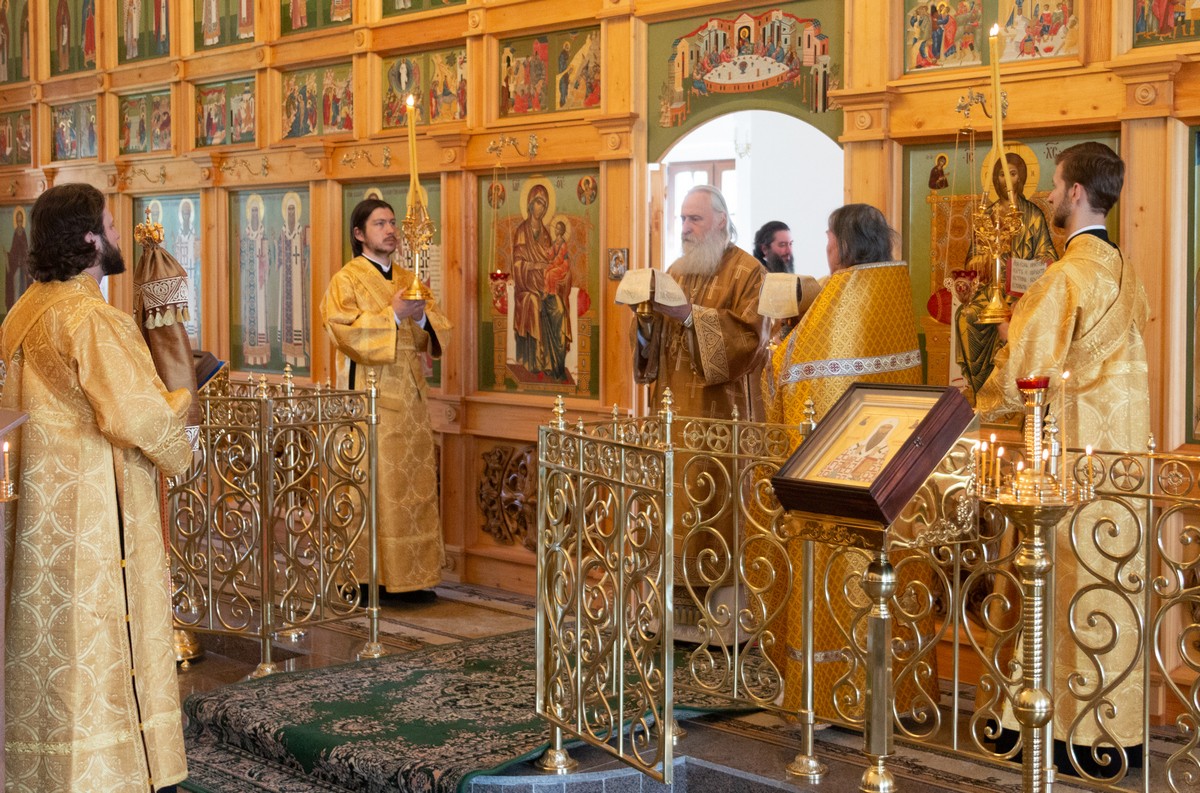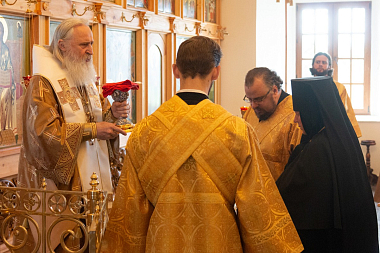 Его Высокопреосвященству сослужили клирики обители.