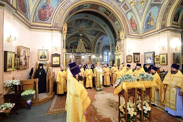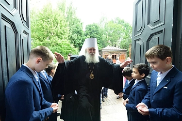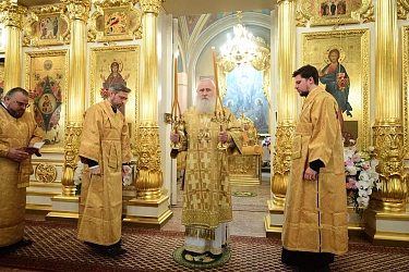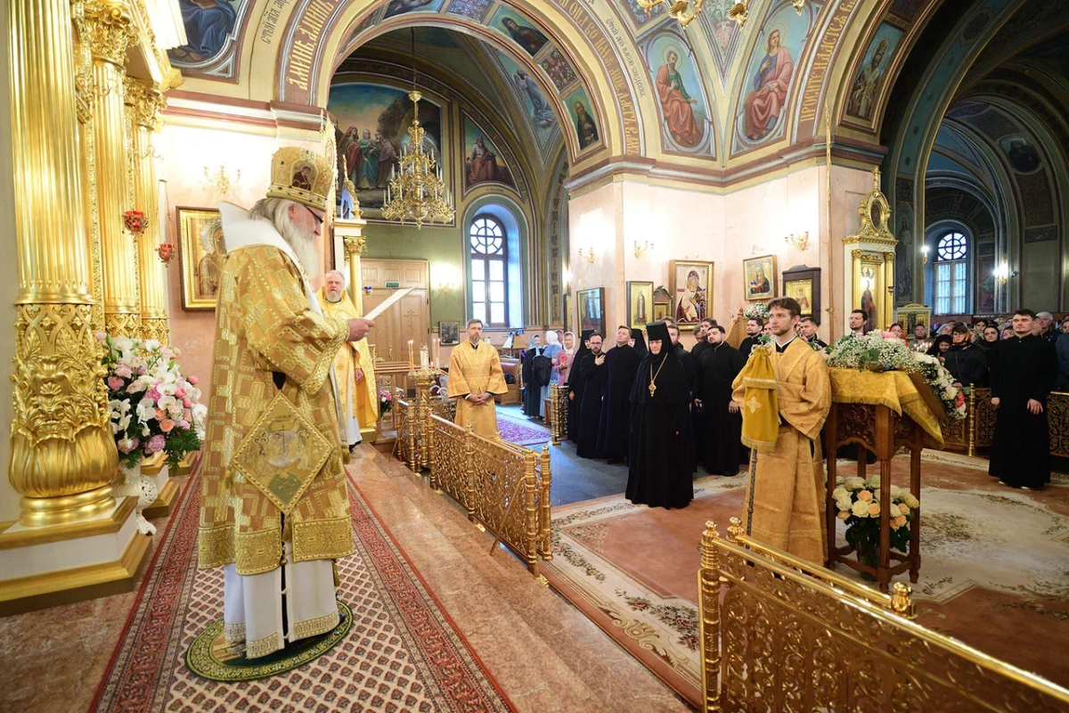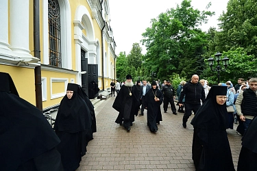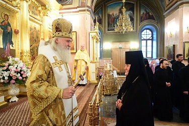Затем Высокопреосвященнейший владыка совершил Божественную литургию в храме Воскресения Словущего в сослужении духовенства обители.