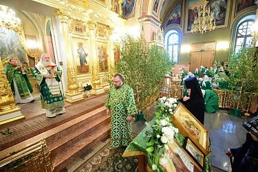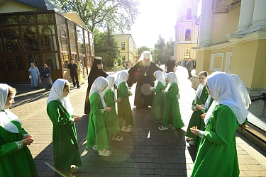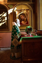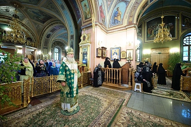 По прибытии в обитель архипастырь поклонился честным мощам блаженной Матроны Московской, почивающим в Покровском храме, а затем возглавил Божественную литургию в храме Воскресения Словущего.