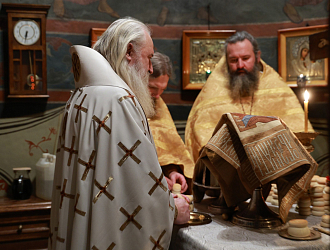 Его Высокопреосвященству сослужила братия обители в священном сане.