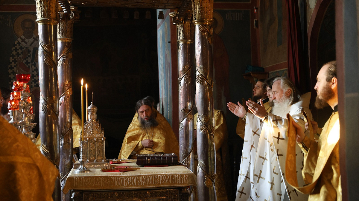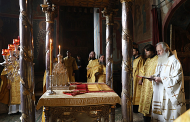 За Литургией Его Высокопреосвященству сослужила братия обители в священном сане.