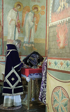 Накануне вечером в монастыре было совершено всенощное бдение с чином выноса Честного и Животворящего Креста Господня.