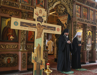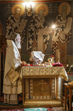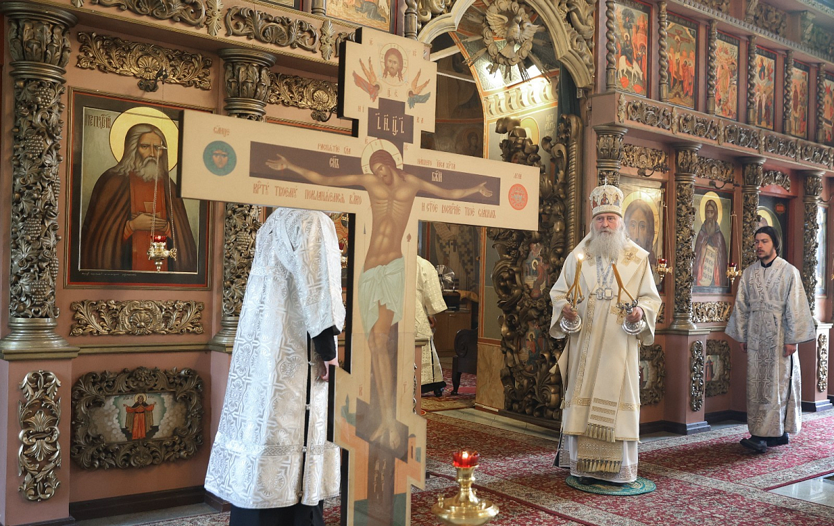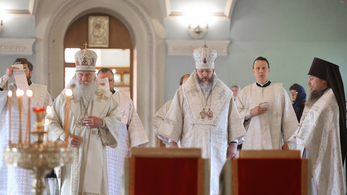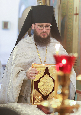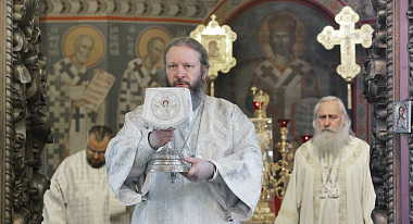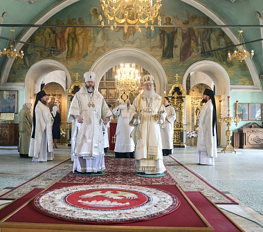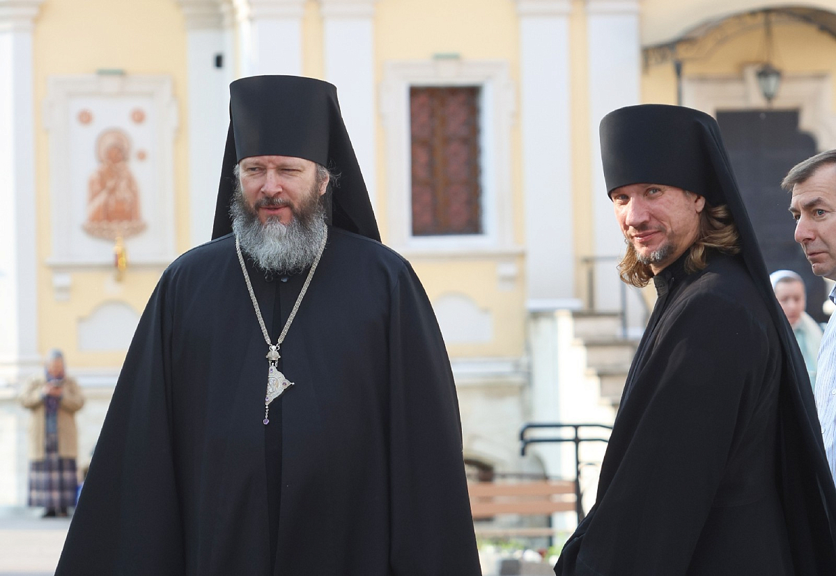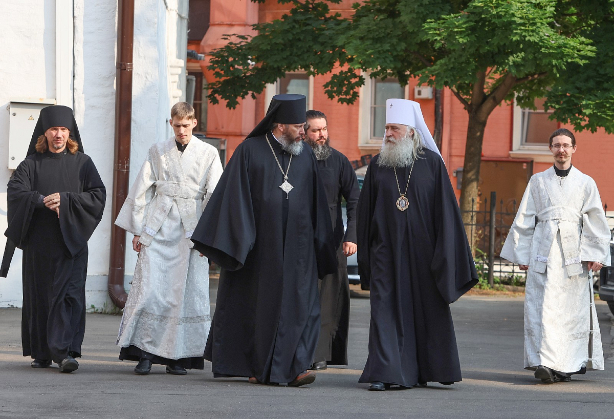 Его Высокопреосвященству сослужили наместник Высоко-Петровского монастыря епископ Луховицкий Евфимий, братия обители в священном сане.