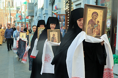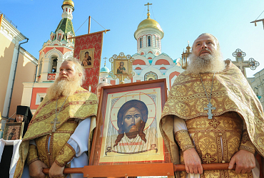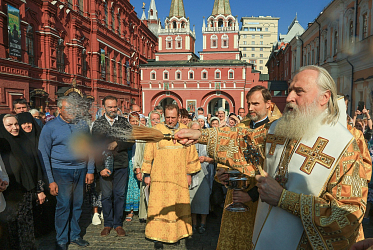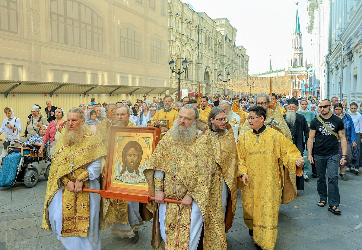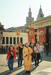 По заамвонной молитве состоялся традиционный крестный ход по улицам Москвы вокруг территории обители. Торжественная процессия прошла от Заиконоспасского монастыря по Никольской улице к месту, где находился Николо-Греческий монастырь, затем к Воскресенским воротам, далее к Казанскому собору на Красной площади и возвратилась в Заиконоспасский монастырь.