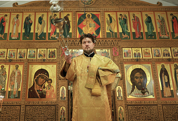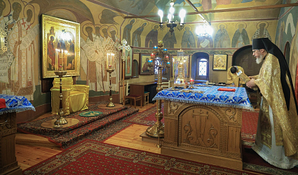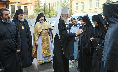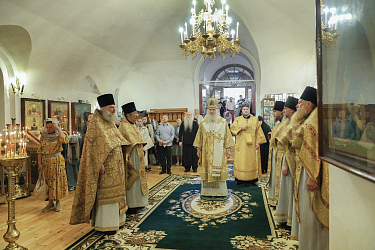 Его Высокопреосвященству сослужили и.о. наместника Заиконоспасского монастыря иеромонах Даниил (Константинов), братия обители в священном сане.