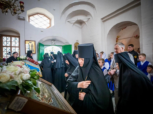 За Литургией молились заместитель председателя Синодального отдела по монастырям и монашеству, настоятельница Зачатьевского монастыря игумения Иулиания (Каледа), прихожане и сестры обители.