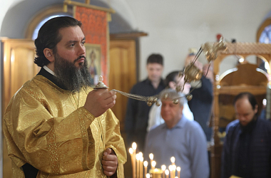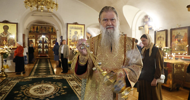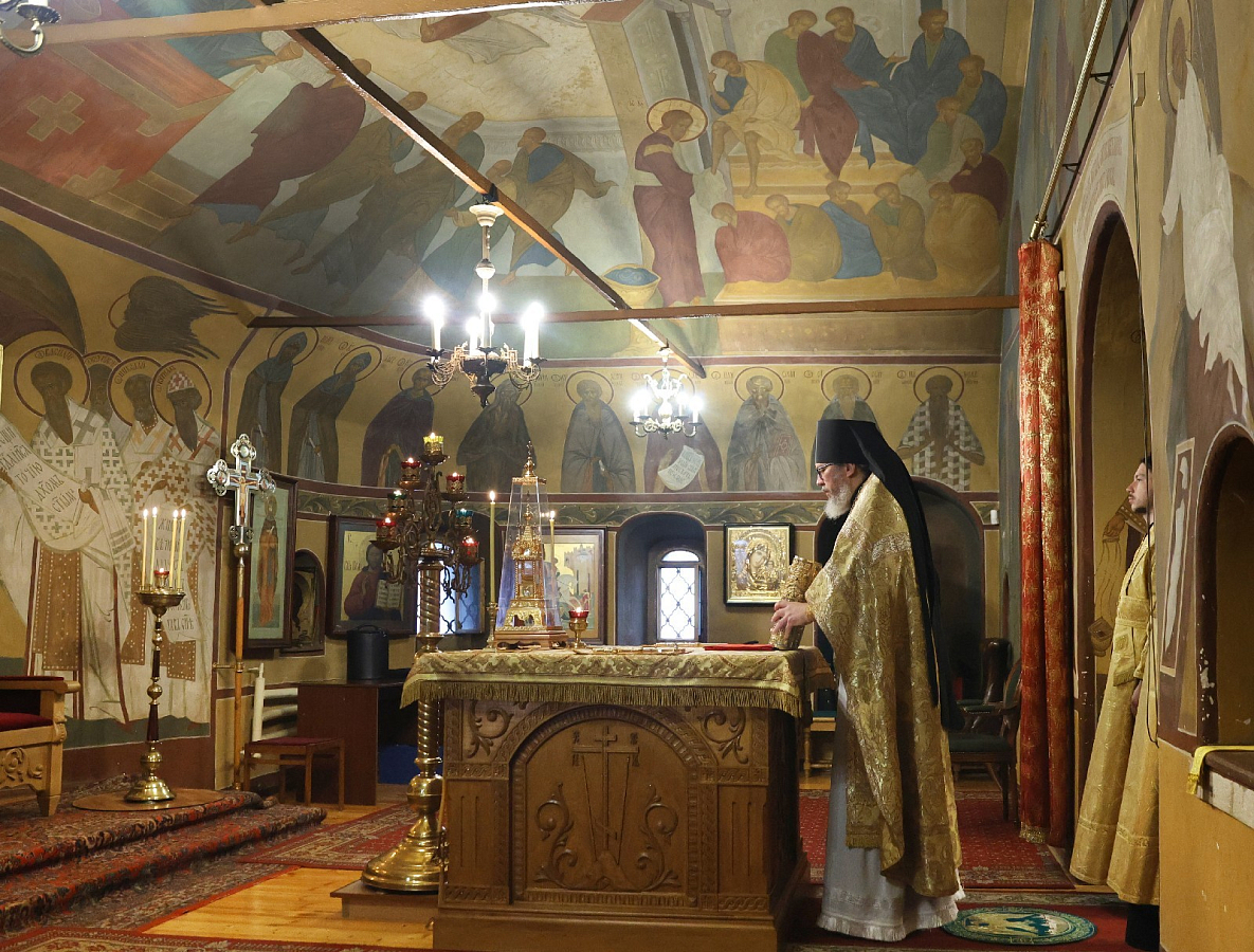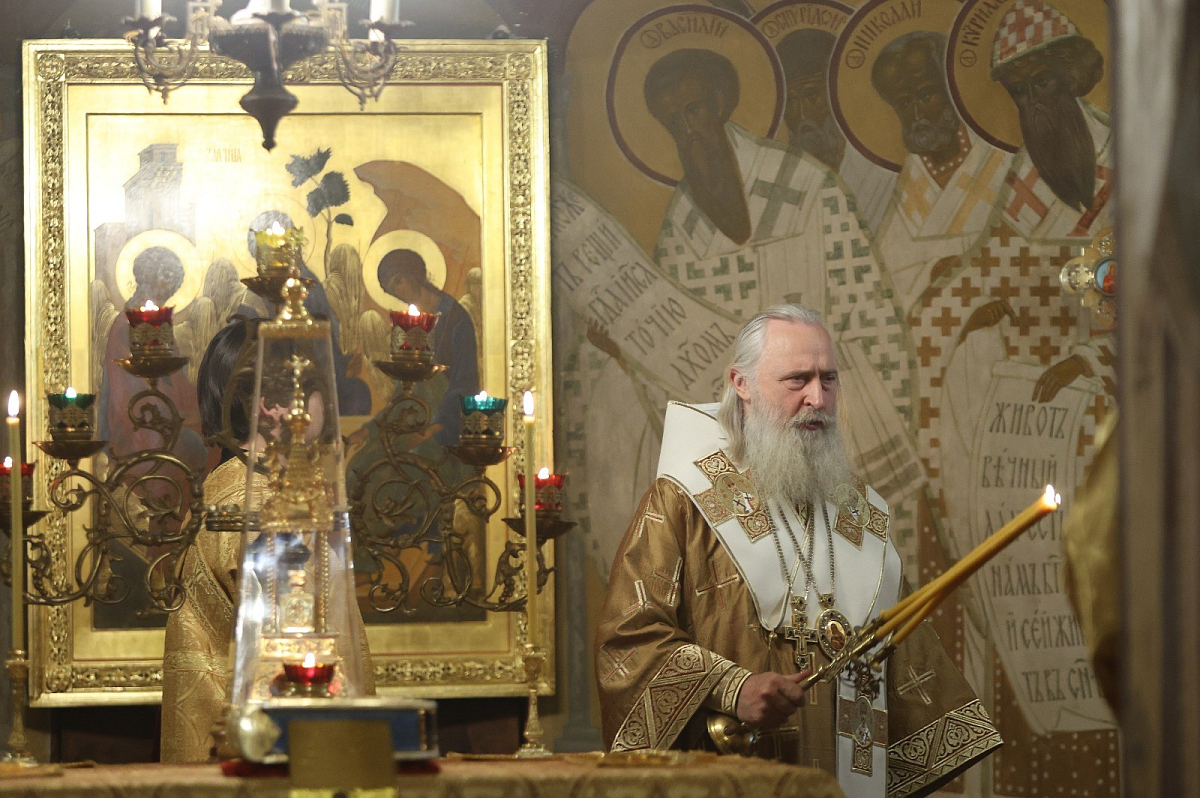 Его Высокопреосвященству сослужили и.о. наместника Заиконоспасского монастыря иеромонах Даниил (Константинов), братия обители в священном сане.