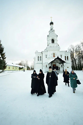 Архипастырь в сопровождении игумении Феофании посетил храм Живоначальной Троицы – великолепный памятник «нарышкинского» барокко XVII века, храм преподобного Серафима Саровского, трапезную, сестринский корпус, а также обширную территорию Подворья. Все здания были отреставрированы или возведены с нуля под руководством игумении Феофании в 2013 – 2019 годах.
