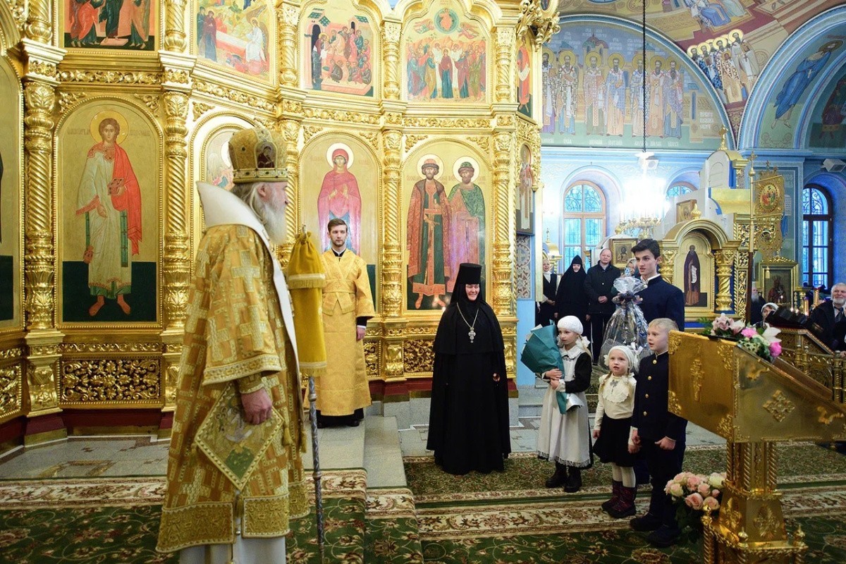 Матушка Феофания и учащиеся Православной гимназии приветствовали Высокопреосвященнейшего владыку Феогноста и преподнесли ему на память подарки, сделанные своими руками.