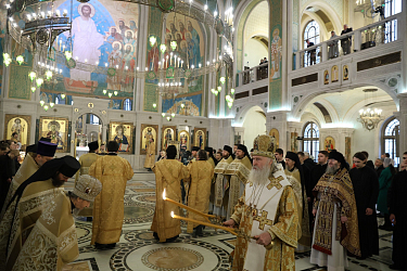 Высокопреосвященному владыке сослужили наместник Сретенского монастыря, и.о. ректора Сретенской духовной академии игумен Иоанн (Лудищев) и братия обители в священном сане.