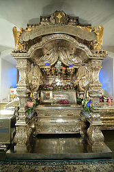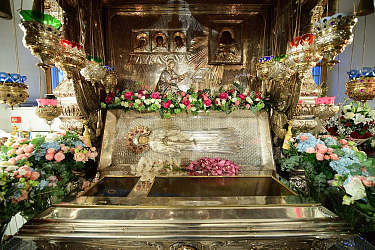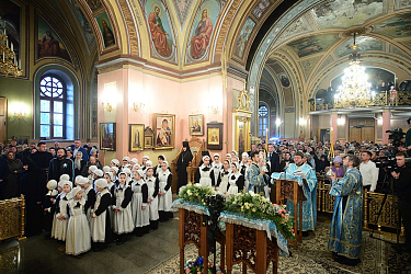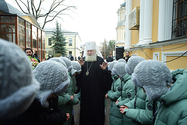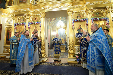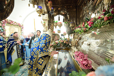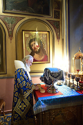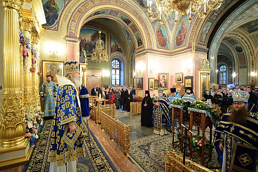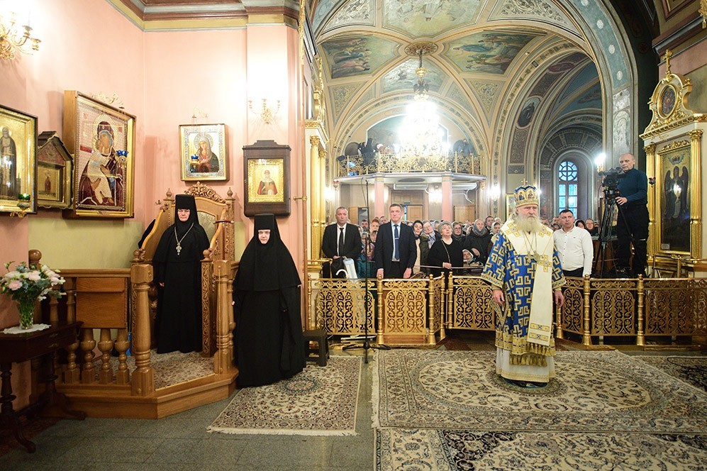 По прибытии в обитель архипастырь поклонился честным мощам блаженной Матроны Московской, а затем возглавил позднюю Божественную литургию в Воскресенском соборе обители.