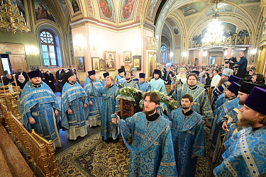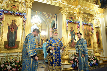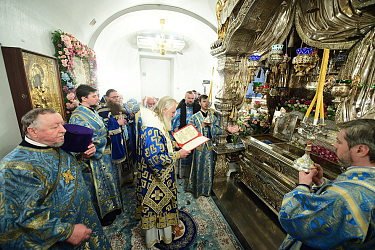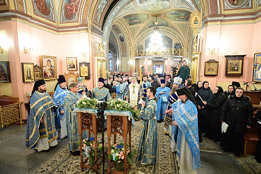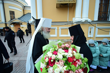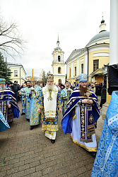 Его Высокопреосвященству сослужили протопресвитер секретарь Патриарха Московского и всея Руси по г. Москве Владимир Диваков, благочинный Покровского церковного округа г. Москвы протоиерей Олег Егоров, духовенство обители.