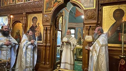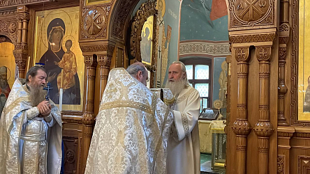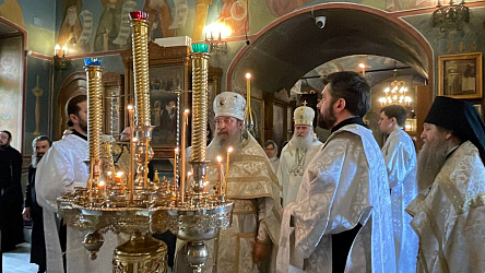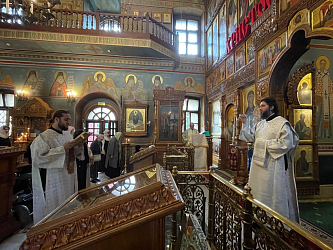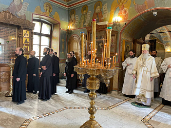 Его Высокопреосвященству сослужили настоятель подворья архимандрит Мелхиседек (Артюхин), братия подворья в священном сане.