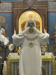 На малом входе митрополит Феогност зачитал указ Святейшего Патриарха Московского и всея Руси Кирилла: «Настоящим удостоить очередных богослужебно-иерархических наград к празднику Святой Пасхи 2024 года следующих клириков: архимандрит Мелхиседек (Артюхин) удостаивается правом служения Божественной литургии с отверстыми Царскими Вратами по «Отче наш».