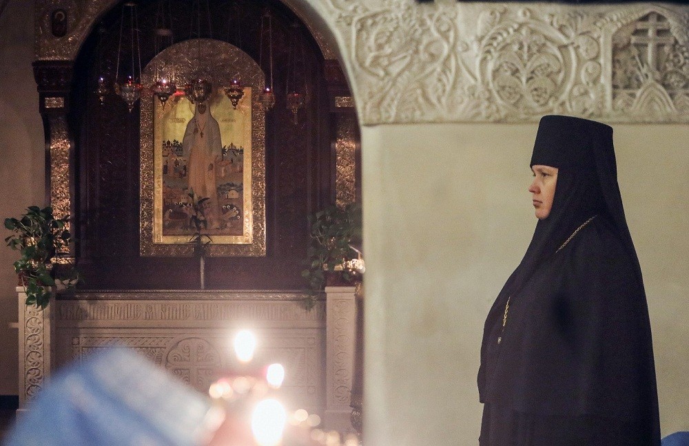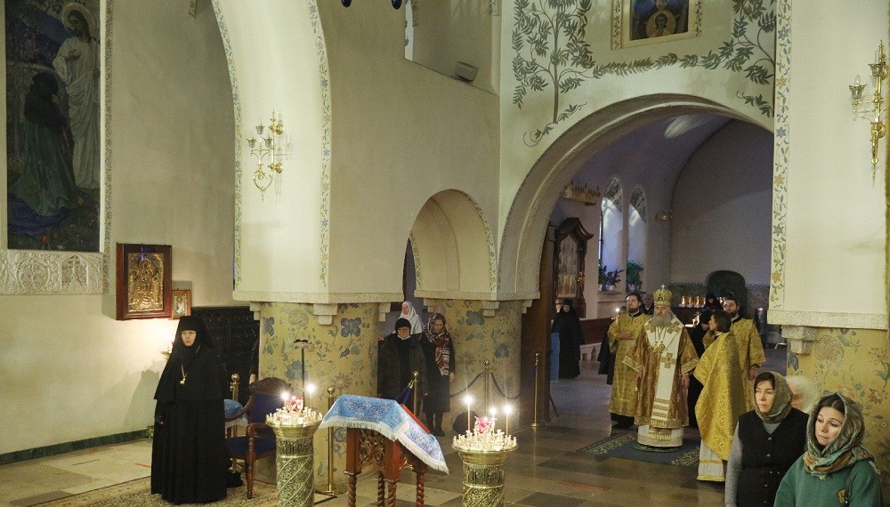 На Литургии молились настоятельница Марфо-Мариинской обители игумения Елисавета (Позднякова) с сестрами и прихожане обители.