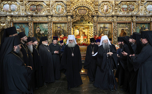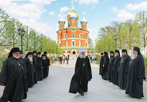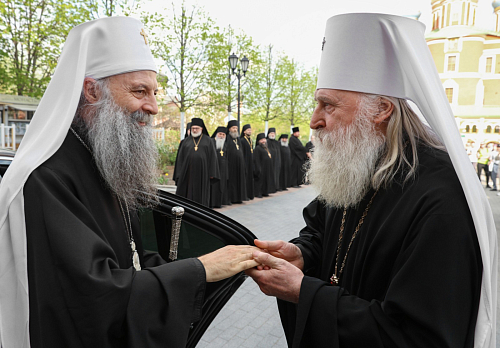 Святейшего Патриарха Порфирия встречал председатель Синодального отдела по монастырям и монашеству, наместник Донского монастыря митрополит Каширский Феогност с братией обители.