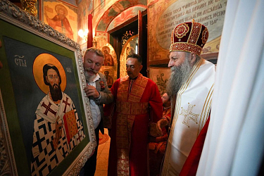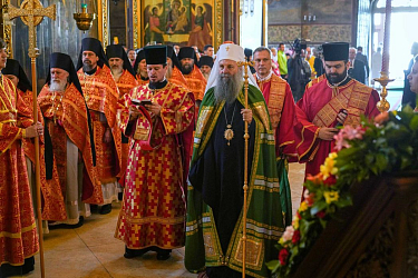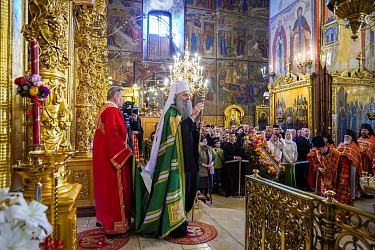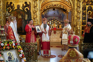 По окончании Литургии епископ Сергиево-Посадский и Дмитровский Кирилл от лица братии Лавры приветствовал Предстоятелей Русской и Сербской Православных Церквей. Святейшему Патриарху Кириллу епископ Кирилл преподнес картину с изображением Лавры, созданную членом Союза художников России А.С. Горбуновым, Святейшему Патриарху Порфирию – икону преподобного Сергия Радонежского.