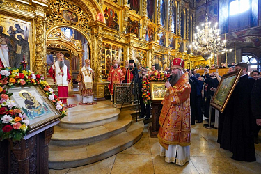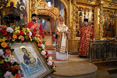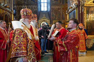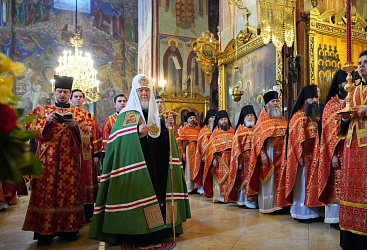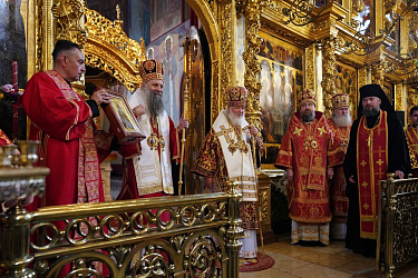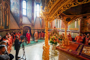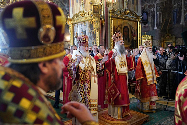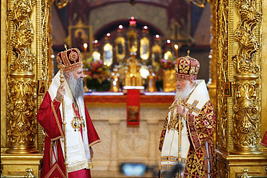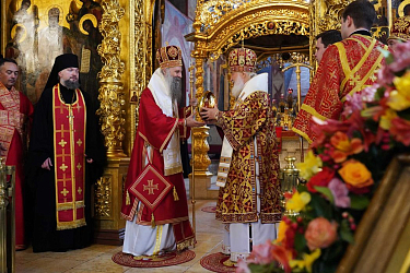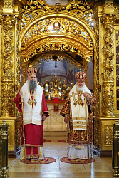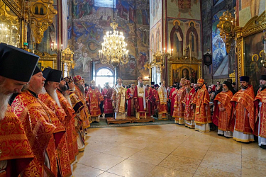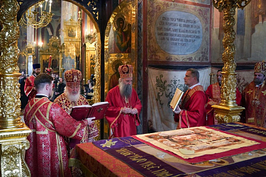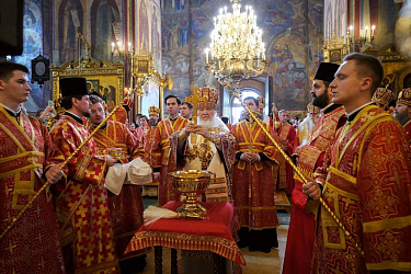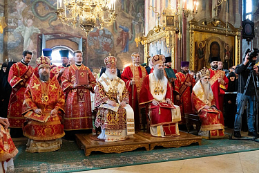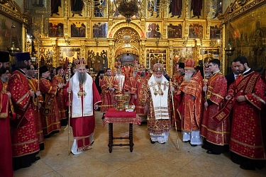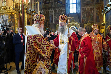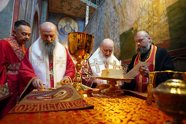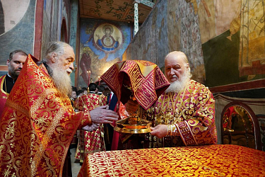 В Успенском соборе Святейший Патриарх Кирилл и Святейший Патриарх Порфирий совершили Божественную литургию.