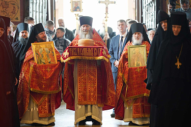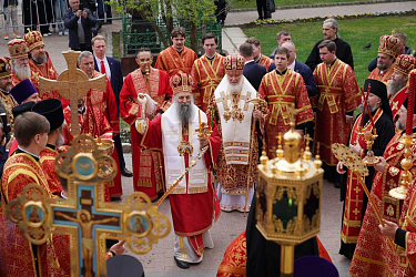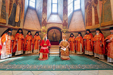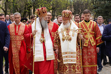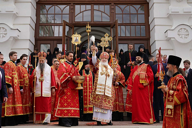 Далее Предстоятели Русской и Сербской Православных Церквей совершили в Успенском соборе водосвятный молебен, после чего возглавили крестный ход вокруг собора.