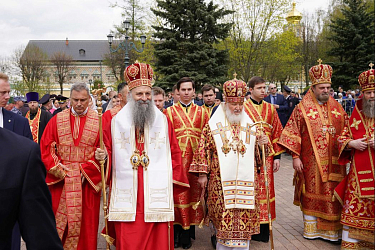 Делегация Сербской Православной Церкви во главе со Святейшим Патриархом Сербским Порфирием прибыла в Москву 21 апреля. 22 апреля в Патриаршей и Синодальной резиденции в Даниловом монастыре в Москве состоялась встреча Предстоятелей Русской и Сербской Православных Церквей. В тот же день со Святейшим Патриархом Кириллом и Святейшим Патриархом Сербским Порфирием встретился в Кремле Президент Российской Федерации В.В. Путин.