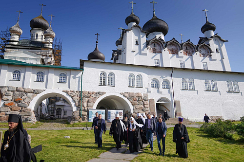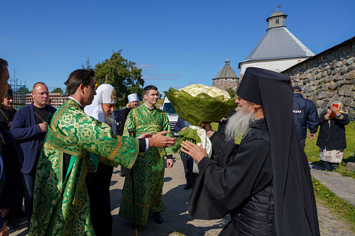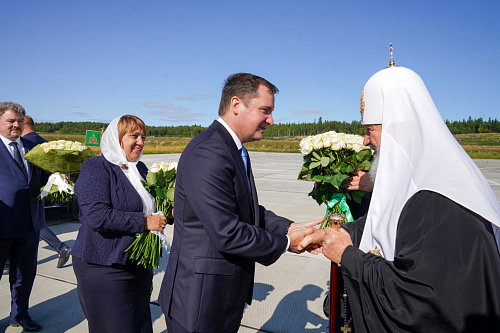 В аэропорту Соловки Святейшего Владыку приветствовали: губернатор Архангельской области А.В. Цыбульский, наместник Соловецкого монастыря епископ Озерский Порфирий, председатель Совета Фонда по сохранению и развитию Соловецкого архипелага А.В. Гуц, заместитель министра культуры Российской Федерации С.Г. Обрывалин, глава муниципального образования «Приморский муниципальный район» В.А. Рудкина.