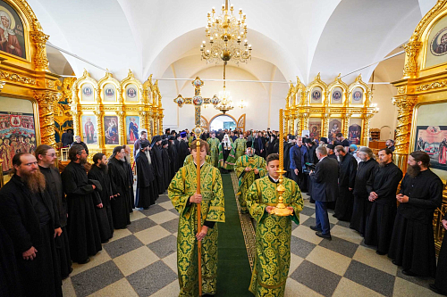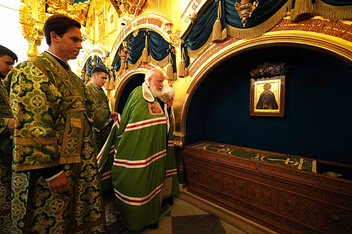 Святейший Владыка проследовал в Свято-Троицкий Зосимо-Савватиевский собор, где поклонился мощам преподобных Зосимы, Савватия и Германа Соловецких.