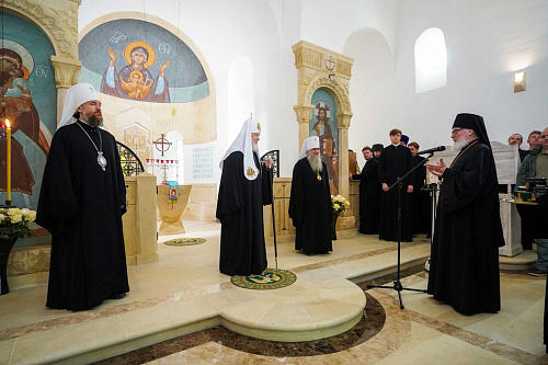 Все это осуществилось. Здесь, в этом храме, мы старались сделать все так, чтобы не было ничего лишнего, отвлекающего от молитвы. Здесь творит молитву один из братьев, священнослужитель, а другие братья внимают его молитве, молятся вместе с ним. Поэтому мы не хотели делать большой иконостас, в золоте, с какими-то украшениями, а постарались сделать предельно просто, но в то же время так, чтобы все напоминало о Древней Церкви, о Святой Земле, об Иерусалиме. В оформлении храма использован песчаник, акустика здесь замечательная, и даже молитва, которая читается шепотом, очень хорошо слышна… Это храм, который не боится тишины, – напротив, это храм для безмолвия, для молитвы. И благодарим Вас за преподанное благословение, за возможность, которую Вы нам тогда дали, чтобы братия могла молиться и совершать здесь Евхаристию».