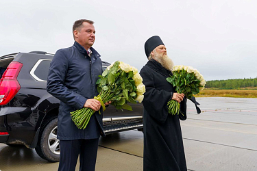 В аэропорту Соловки Святейшего Владыку приветствовали губернатор Архангельской области А.В. Цыбульский, наместник Соловецкого монастыря епископ Озерский Порфирий.