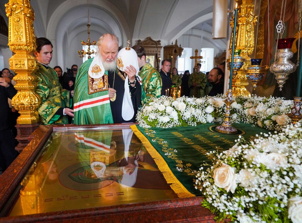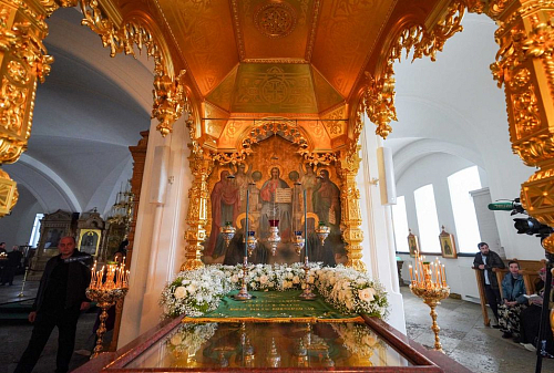 Святейший Патриарх Кирилл совершил славление перед мощами преподобных Сергия и Германа Валаамских в нижнем храме Спасо-Преображенского собора Валаамской обители, после чего поклонился чтимому списку Валаамской иконы Божией Матери и мощам преподобного Антипы Валаамского.