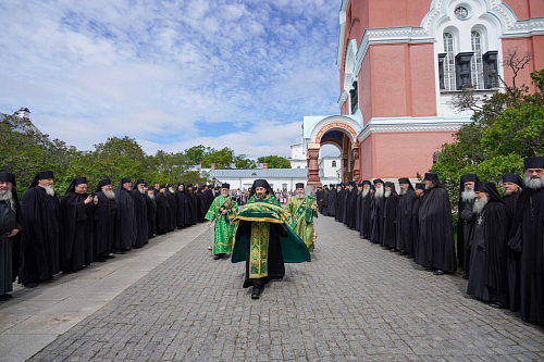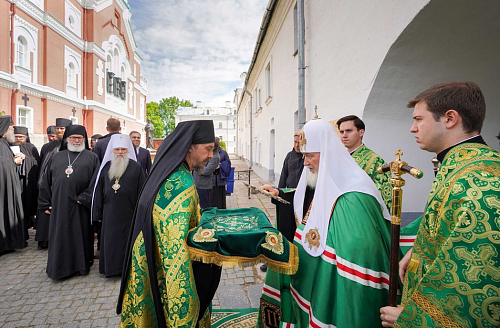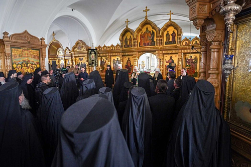 В святых вратах обители Святейшего Владыку встречала братия монастыря.