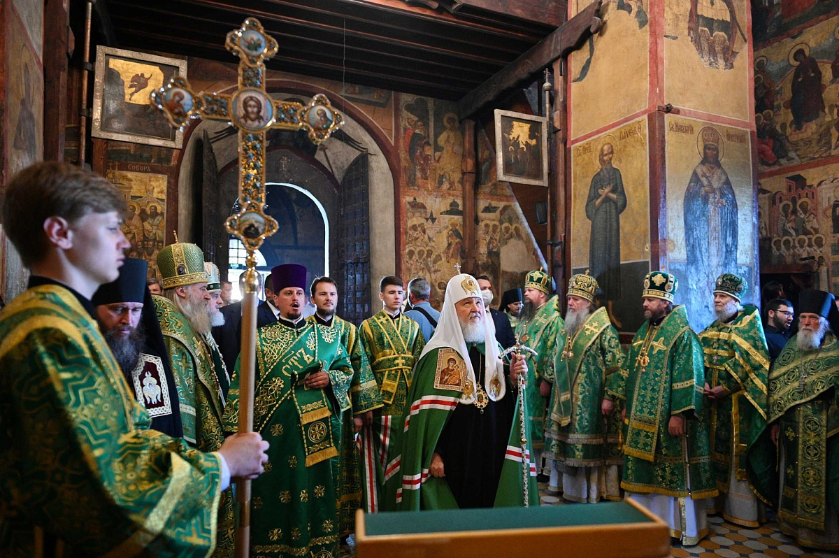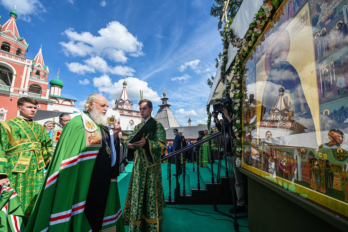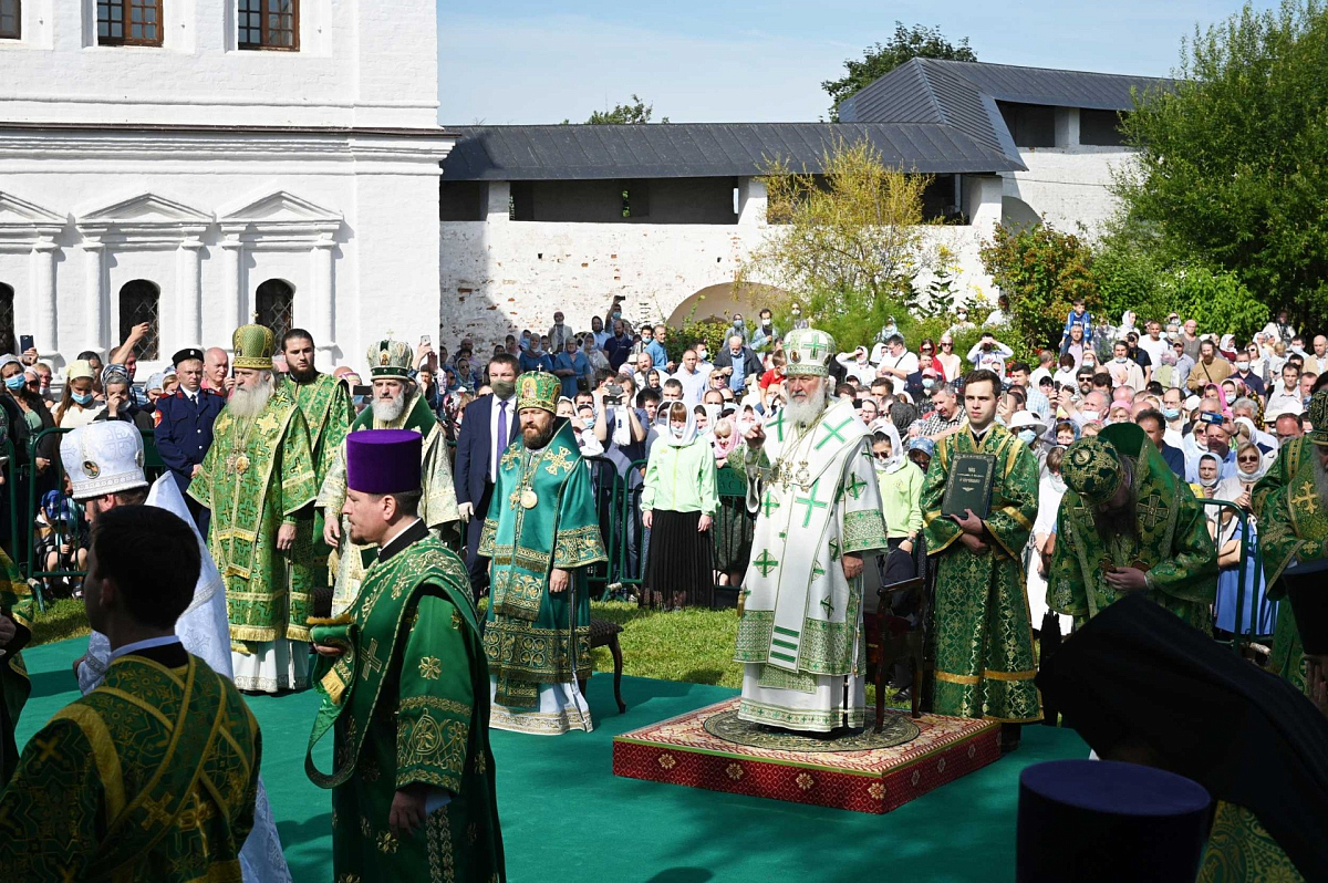 У святых врат Предстоятеля Русской Православной Церкви встречали архиереи, прибывшие на праздник в Саввино-Сторожевский монастырь, наместник обители архимандрит Павел (Кривоногов) с братией монастыря, заместитель главы администрации Одинцовского городского округа Московской области В. В. Переверзева, начальник территориального управления Звенигород администрации Одинцовского городского округа Р. Х. Мангушев.