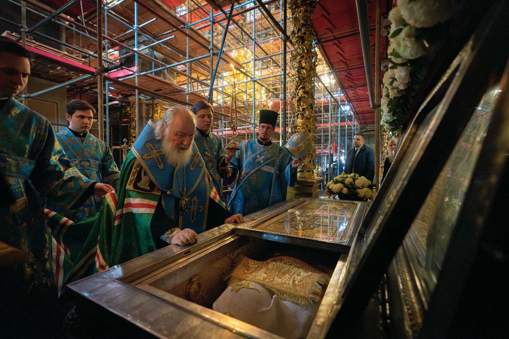 В завершение молебна Предстоятель Русской Церкви прочитал молитву святителю Тихону. Святейший Владыка поклонился честным мощам святителя, а также Донской иконе Божией Матери.