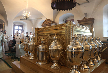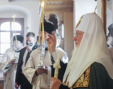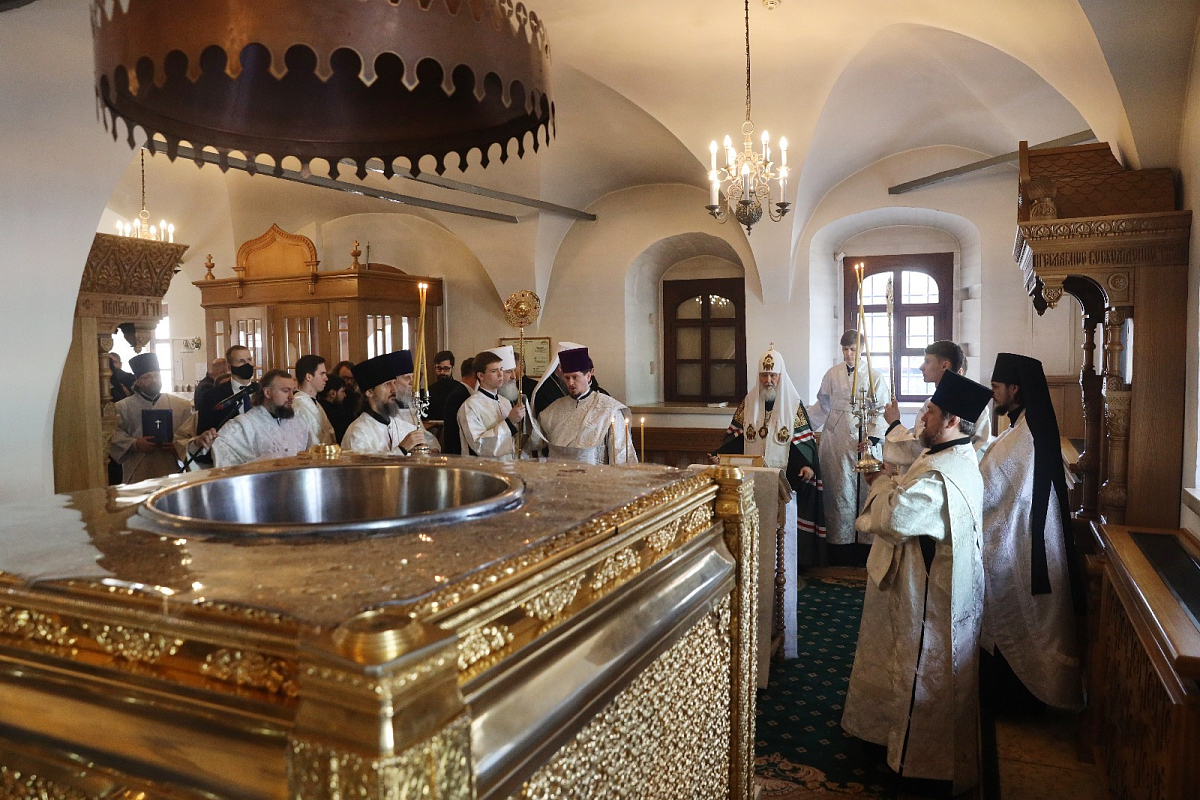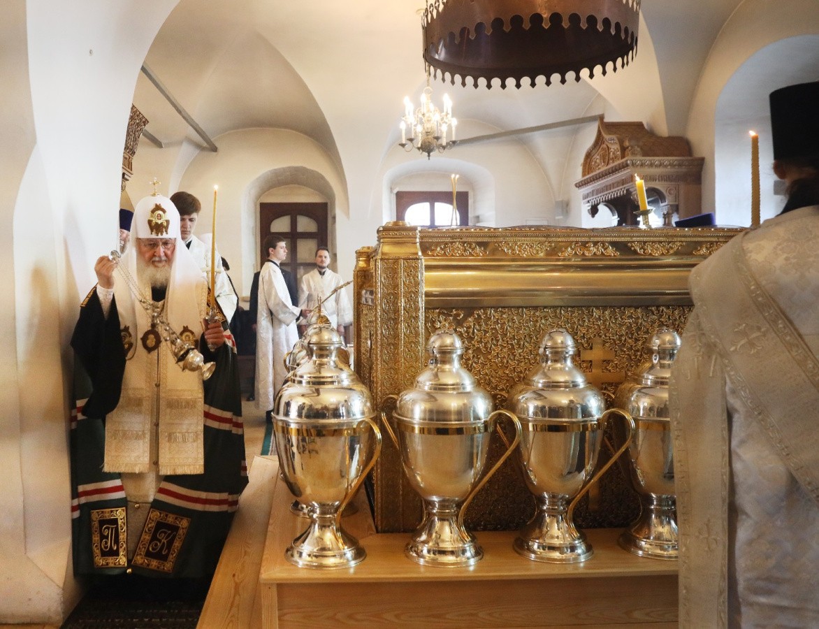 18 апреля 2022 года, в понедельник Страстной седмицы, в Малом соборе Донского ставропигиального монастыря г. Москвы Святейший Патриарх Московский и всея Руси Кирилл совершил молебен на начало чина мироварения.