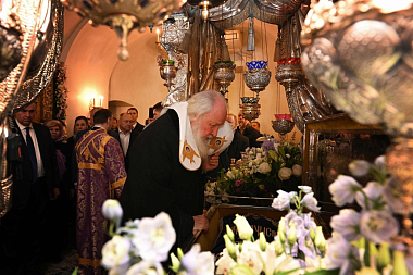 По прибытии в монастырь Святейший Патриарх Кирилл поклонился честным мощам блаженной Матроны, почивающим в храме Покрова Пресвятой Богородицы, и прочитал молитву у раки со святыми мощами.
