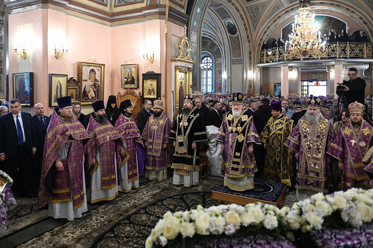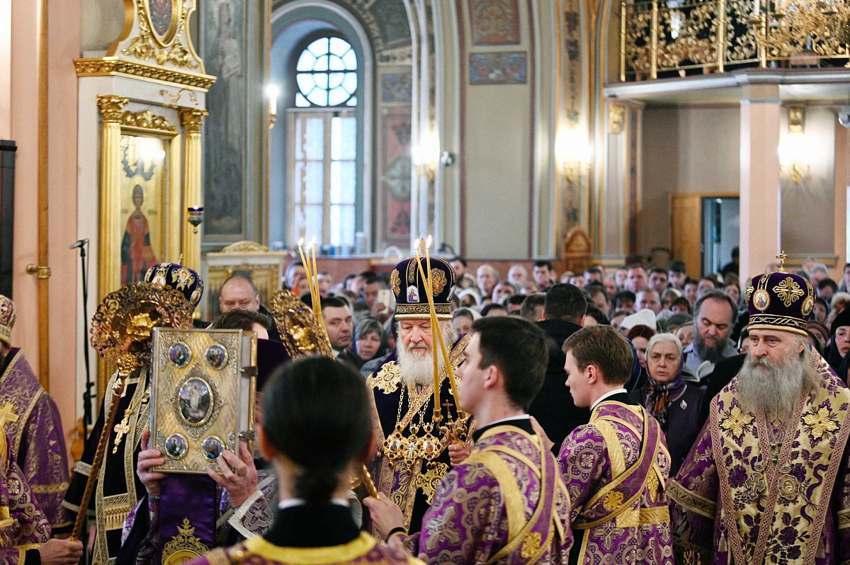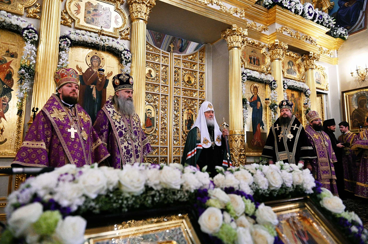 Затем Предстоятель Русской Православной Церкви возглавил Божественную литургию в монастырском храме Воскресения Словущего.