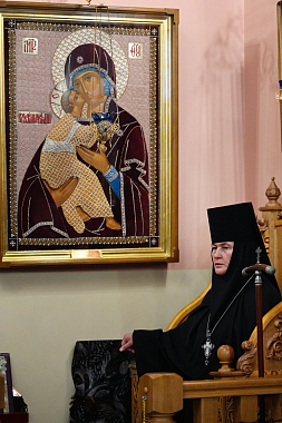 «Сегодня мы вспоминаем святую старицу Матрону Московскую, но не так, как обычно вспоминают исторических личностей. Мы вспоминаем ее не только разумом своим, но и в наших сердцах, потому что она оставила такой след в жизни города Москвы, какой не оставляли и люди великие, славные, могущественные. К кому из исторических личностей ко гробу приходит столько людей? Ни к кому! А к старице Матроне, слепой женщине, пораженной страшным недугом, которая всю свою жизнь лежала, не видя света Божия, не имея возможности передвигаться, люди идут и идут, и будут идти, потому что она предстательством пред Господом отвечает на наши молитвы. Она рядом с нами, ее молитвами вознесся этот дивный монастырь, и, несомненно, ее молитвами подает Господь силу и матушке игумении, и всем сестрам, чтобы в таком благолепии содержалось это святое место.