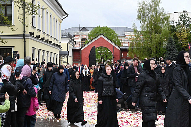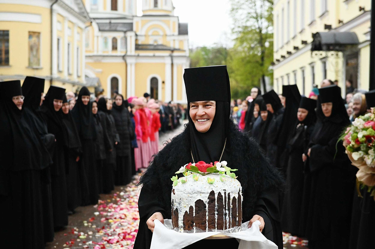 «Промыслом Божиим так случилось, что блаженная старица Матрона Московская была причислена к лику святых именно в пасхальные дни, когда торжествуют небо и земля, когда все мы в радости прославляем Воскресшего Христа, – сказала матушка Феофания. – За эти годы ее молитвами была полностью возрождена из руин древняя Покровская обитель, воссозданы в былом великолепии три монастырских подворья, для честных мощей святой Матроны Московской изготовлена новая добротная рака и сень. Мы открыли приют для детей-сирот, которые постоянно живут и учатся в обители. Более 90 храмов воздвигнуты в честь святой праведной Матроны Московской, причем не только в России, но и в других странах: Белоруссии, Молдове, Украине, США, Греции, Болгарии, Сербии».