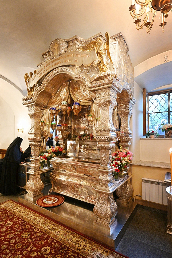 По прибытии в монастырь Святейший Патриарх Кирилл поклонился честным мощам блаженной Матроны, почивающим в храме Покрова Пресвятой Богородицы, и прочитал молитву у раки со святыми мощами.