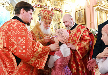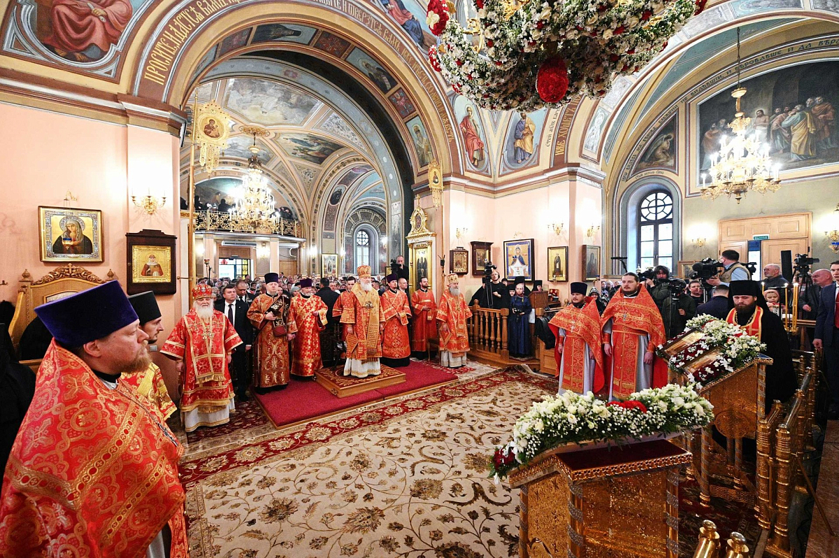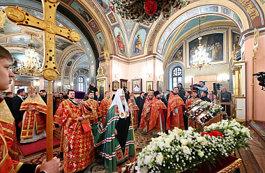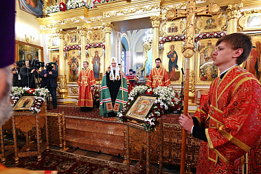 Затем Предстоятель Русской Православной Церкви возглавил Божественную литургию в храме Воскресения Словущего.