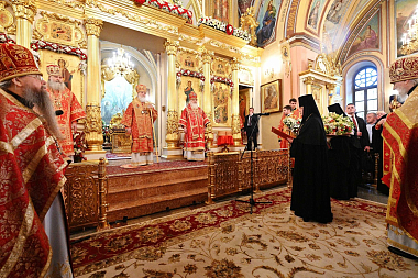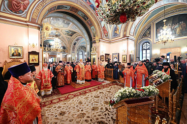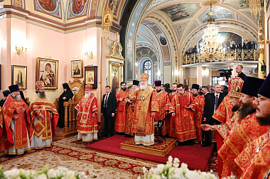 Его Святейшеству сослужили: митрополит Истринский Арсений, первый викарий Патриарха Московского и вея Руси по г. Москве; архиепископ Каширский Феогност, председатель Синодального отдела по монастырям и монашеству; протопресвитер Владимир Диваков, секретарь Патриарха Московского и всея Руси по г. Москве; архимандрит Алексий (Поликарпов), наместник Данилова ставропигиального монастыря; протоиерей Даниил Андреюк, настоятель подворья Православной Церкви в Америке в г. Москве; протоиерей Александр Абрамов, благочинный Покровского церковного округа, настоятель храма свт. Мартина Исповедника в Алексеевской Новой Слободе г. Москвы; столичное духовенство.