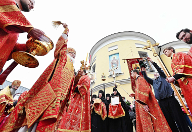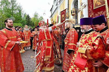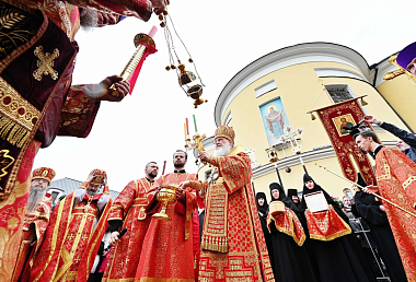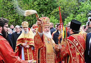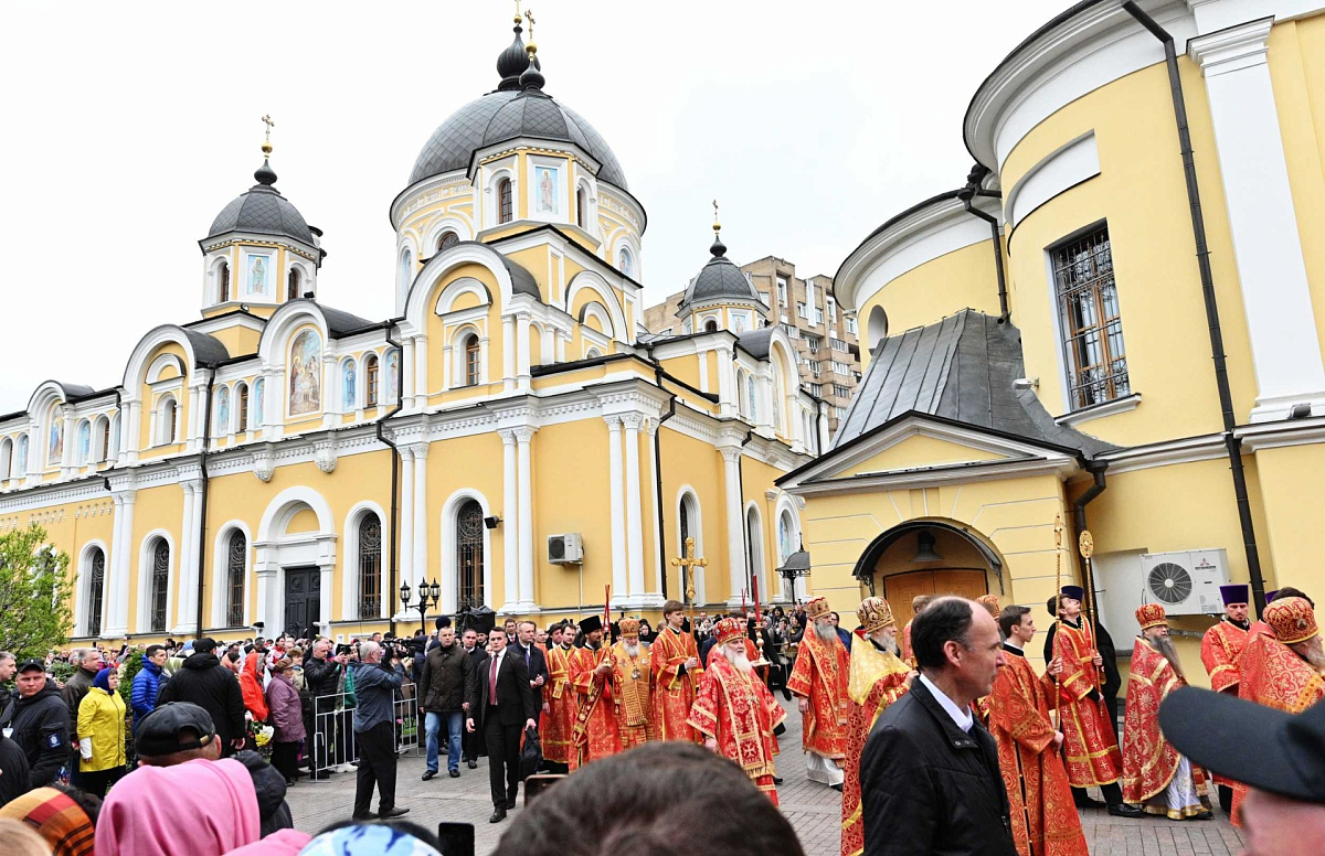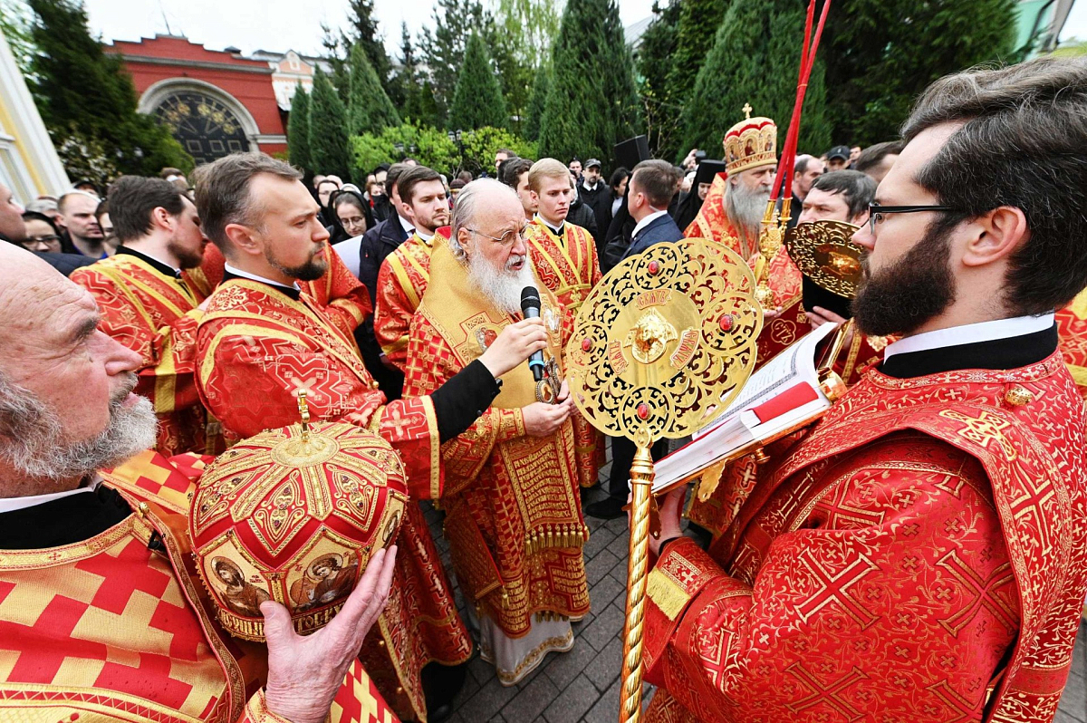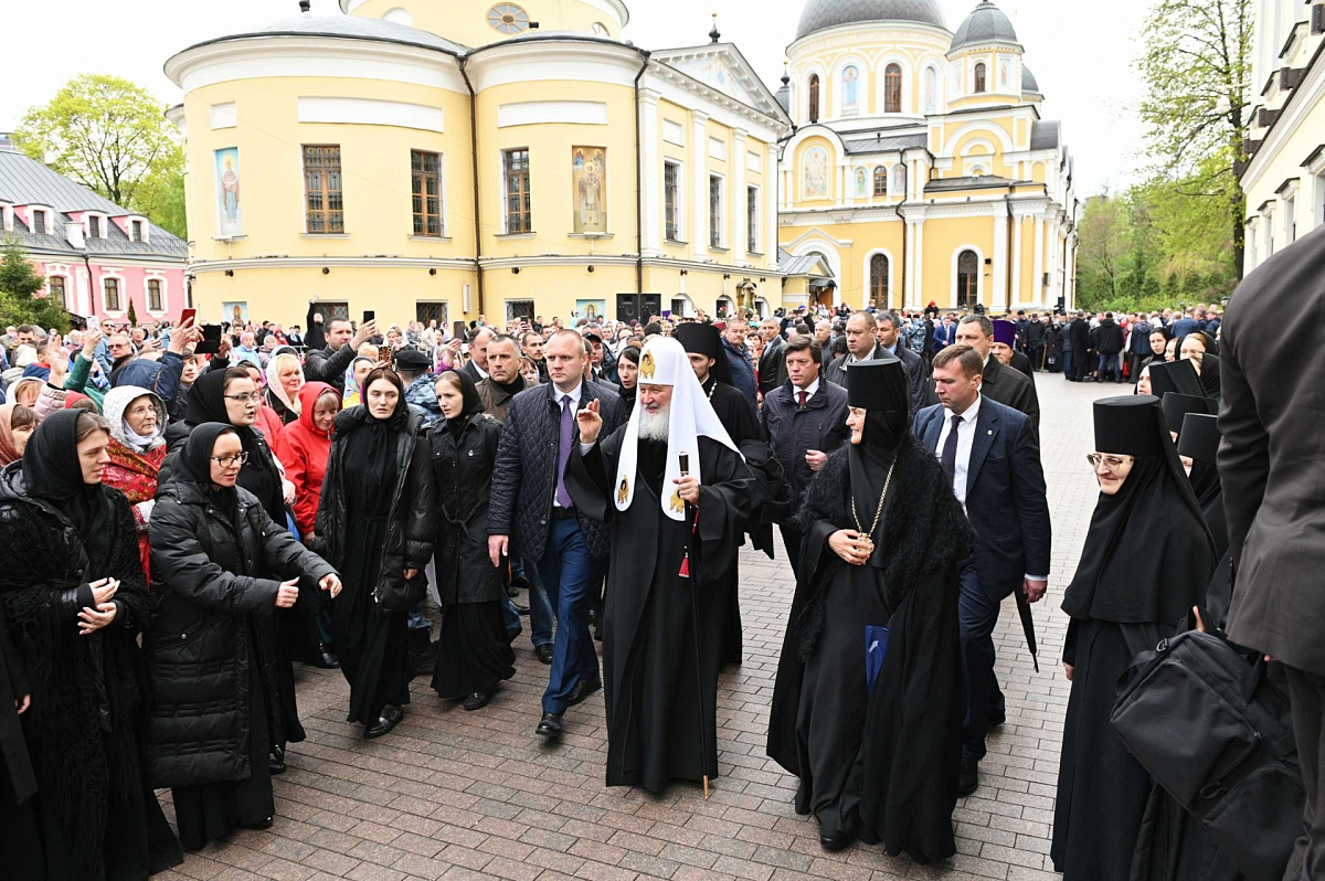 По окончании Литургии Святейший Патриарх Кирилл возглавил крестный вокруг храма.