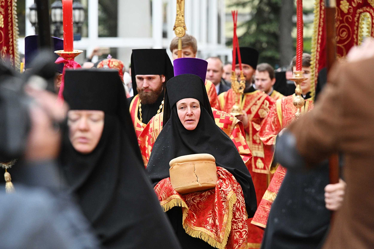 После крестного хода игумения Феофания (Мискина) от лица сестер Покровского монастыря и паломников приветствовала Святейшего Владыку и преподнесла Его Святейшеству пасхальное яйцо и икону блаженной Матроны.